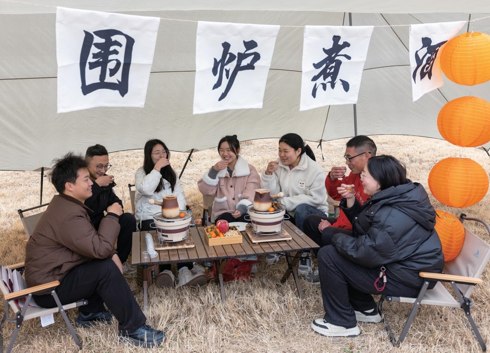 不遠處,露營帳篷下,幾名年輕人圍爐而坐。小爐上的酒壺冒著熱氣,桌上擺滿了水果、零食。志愿者正在展示傳統煮酒技藝,酒香彌漫,市民和游客紛紛圍攏過來。
