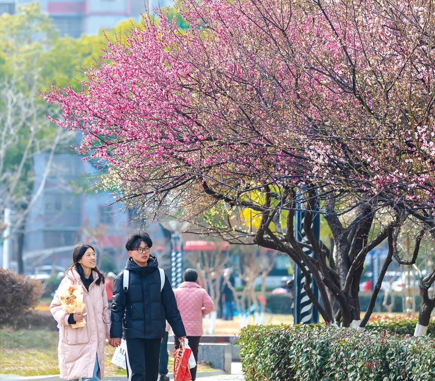 早春時節,城區各處的梅花次第綻放,市民和游客們漫步其中,沉醉于這美好的春日時光。圖為市民在市體育廣場等處賞花、游玩。(攝影 記者 鄭恒 鄧娟)
