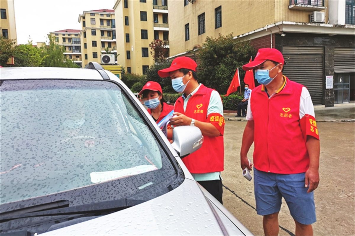 紅馬甲,在行動(dòng)。疫情阻擊戰(zhàn)中,張溝鎮(zhèn)發(fā)揮老黨員、教師、大學(xué)生、熱心村民等群體力量,發(fā)動(dòng)470余名志愿者,堅(jiān)守在卡口值守、核酸檢測、政策宣傳等防控一線。圖為8月10日,新里仁口小學(xué)教師志愿者在居民小區(qū)排查進(jìn)出人員。(攝影記者 胡純波 通訊員 吳云霞)
