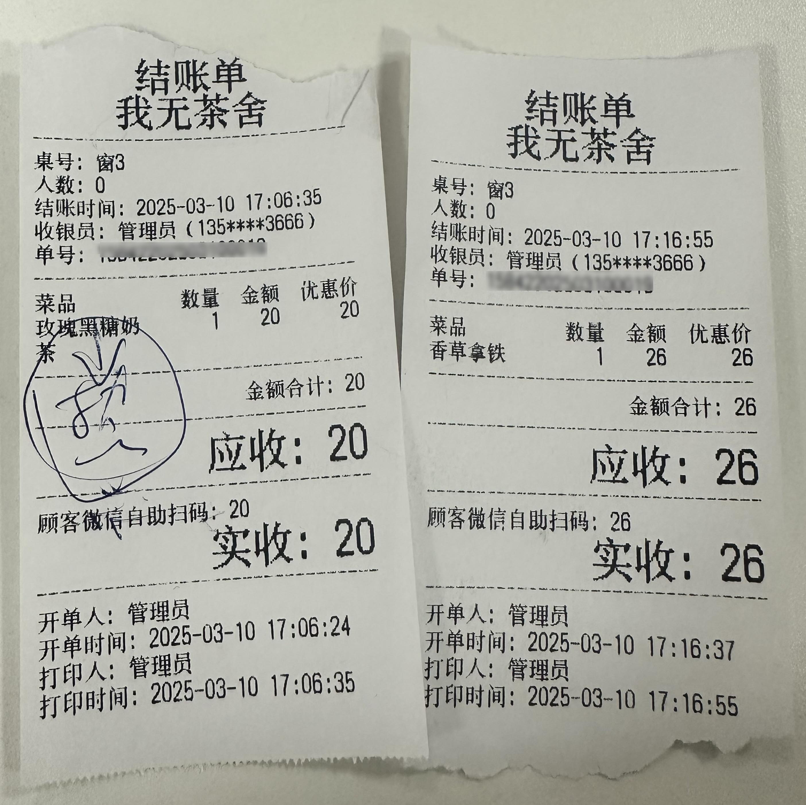 3月10日下午,記者與同伴在小院咖啡的消費憑證