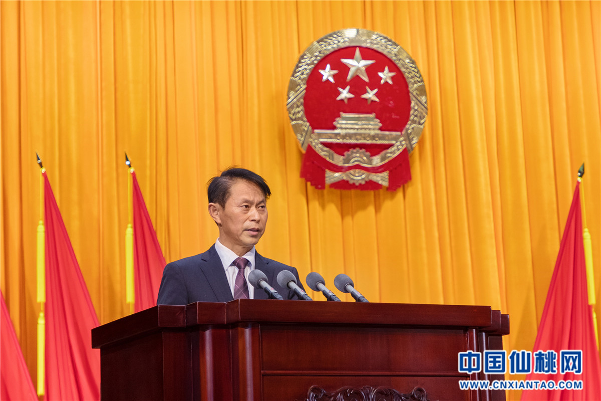 市九屆人大常委會主任嚴啟方代表仙桃市第九屆人民代表大會常務委員會向大會作工作報告。嚴啟方在回顧過去五年工作時說,市九屆人大常委會履職的五年,是仙桃高質量發展的五年。在市委的堅強領導下,市人大常委會深入學習貫徹習近平新時代中國特色社會主義思想、黨的十九大和十九屆歷次全會精神,按照主動、擔當、精準、有效的工作理念,認真履行憲法法律賦予的各項職責。五年來,共審議、視察、調研工業經濟、現代農業、第三產業、項目建設、生態環保、營商環境等經濟發展議題65個。聽取審議專項工作報告116項,對23部法律法規進行執法檢查和調研,對22個政府部門進行專項工作評議,向“一府一委兩院”提出審議意見15件71條。邀請代表列席常委會會議370人次,參加重點司法、重點監督活動1100人次。作出重大事項決議決定17個,任免國家機關工作人員509人次,為仙桃全面建成小康社會、實現高質量發展,提供了強有力的民主法治保障。